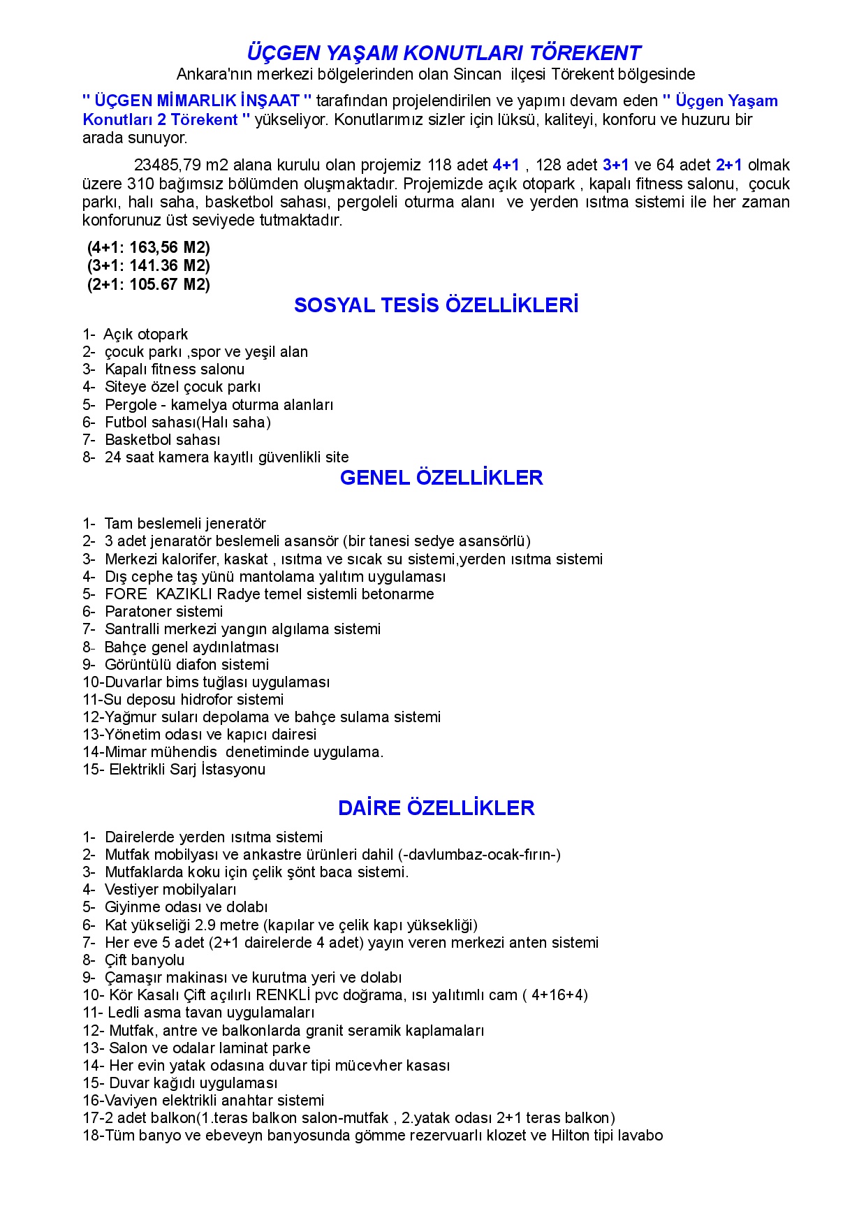 23485,79 m2 alana kurulu olan projemiz 118 adet 4+1, 128 adet 3+1 ve 64 adet 2+1 olmak üzere 310 bağımsız bölümden oluşmaktadır. Projemizde açık otopark, kapalı fitness salonu, çocuk parkı, halı saha, basketbol sahası, pergoleli oturma alanı ve yerden Isıtma sistemi ile her zaman konforunuz üst seviyede tutmaktadır.